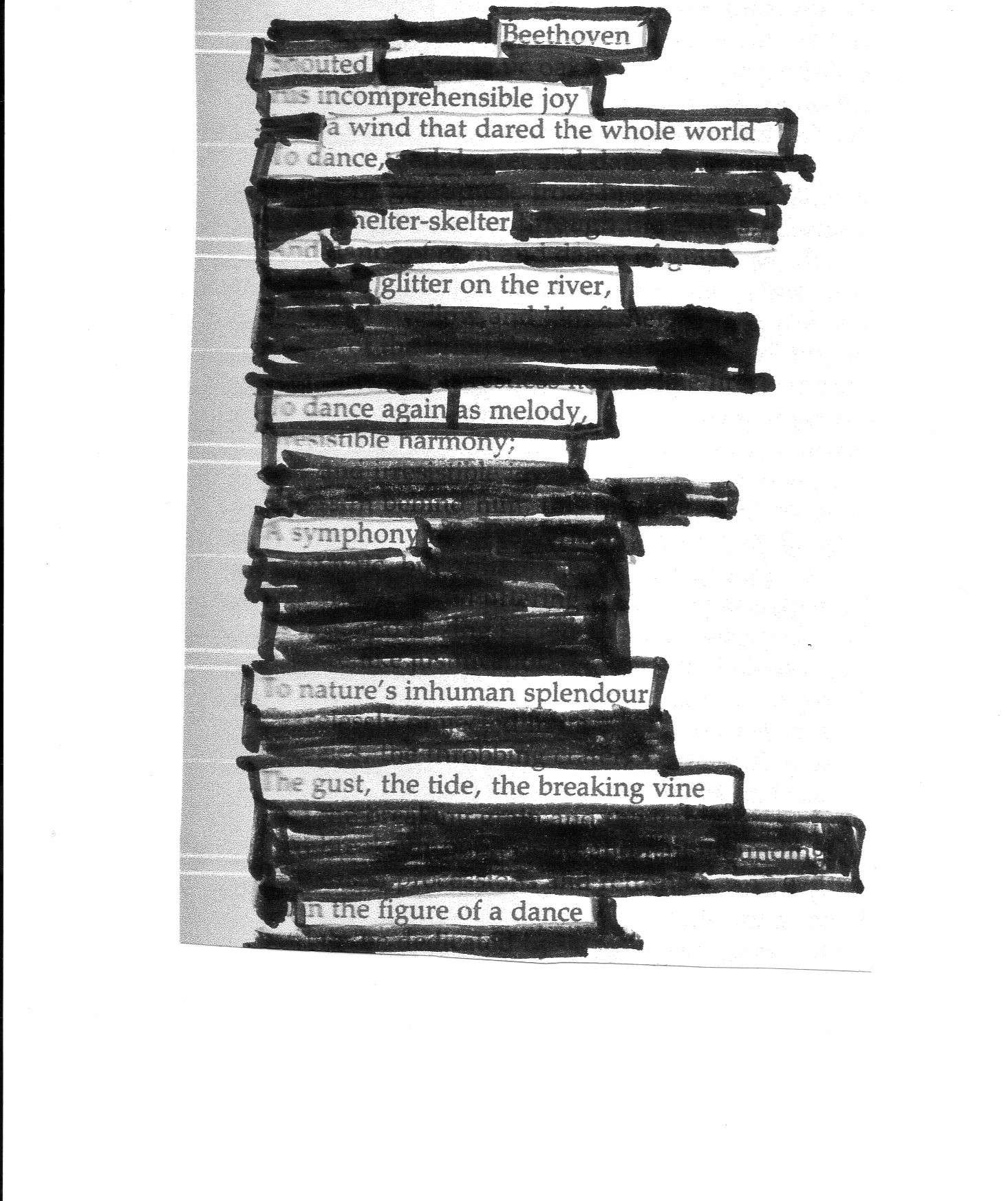 Kim, this is beyond wonderful! I know how difficult creating good blackout poetry can be, and this isn’t just good but great. Before I saw the note and the image, I had no idea that it was found poetry–the poem is so smooth, so natural. It even made me wanting to listen to some Beethoven. Your poem speaks of a sort of bliss the right music can bring out of us. Thank you for the reminder!
