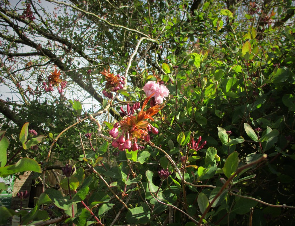 I want to focus on writing, but the view from my window, the one to the right of the desk, calls to me with honeysuckle cascading down the trellis, adorned with gems of dark pink and purple buds. Its space is infringed by a branch from the cherry tree, with one frilly blossom, a pom-pom waiting for its sisters to join in with a rah-rah to the season.