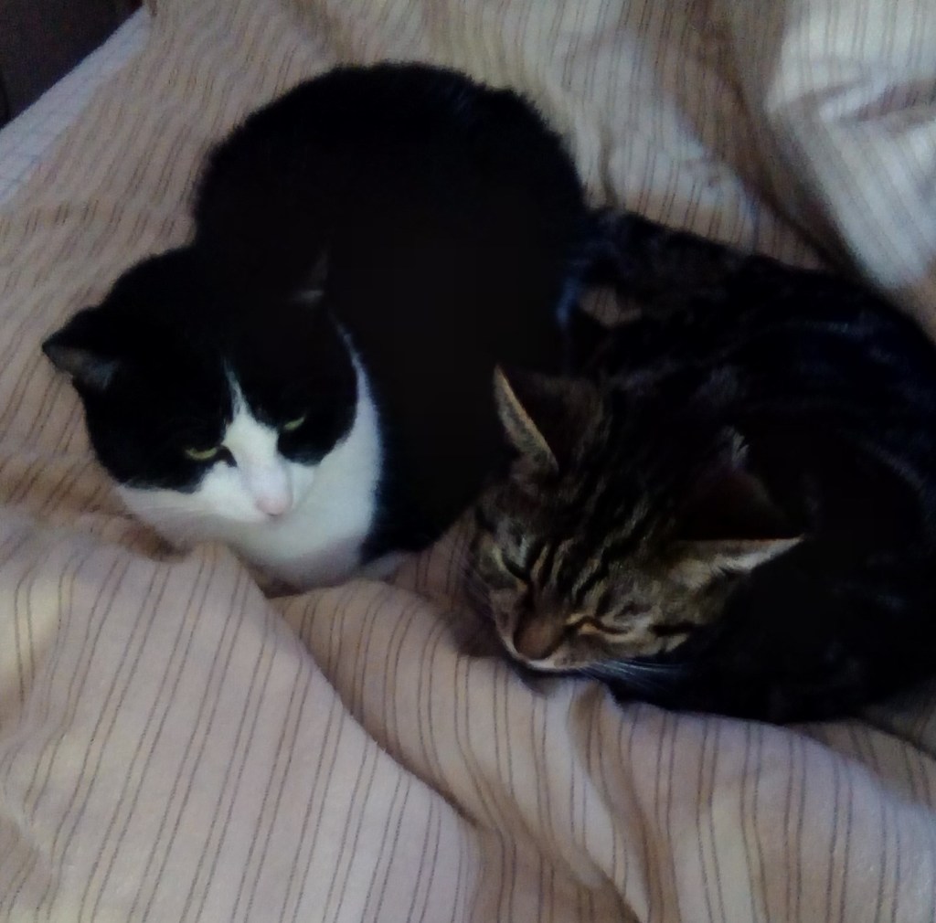 Ghostly Bedfellows In the grey shadows of predawn, I’m woken by companions of the past and the present, haunting my dreams until they’re broken. These ghostly bedfellows curiously haunt, purring, kneading, butting, always knowing I will fill their dishes in the morning. They guard me closely through the night but, once fed, they lick their lips, clean their paws and, tails straight up, slip out the open door to disappear into a bright new day, off to hunt a sun-kissed butterfly or chase a field mouse wandering by. Kim M. Russell, 27th July 2022
