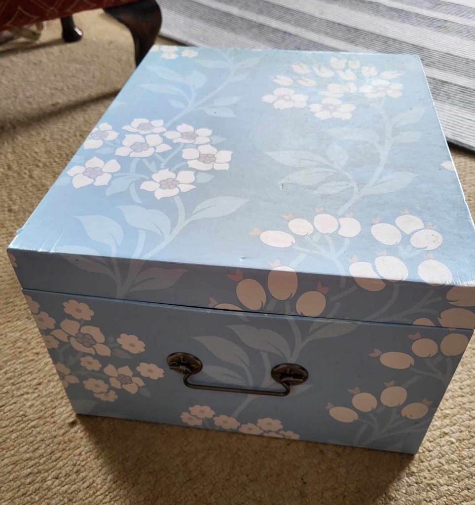 Thank you, Maria. It’s a pretty box but very sturdy. It was the largest of three but the smallest was water damaged. I keep birthday cards and postcards in the other one.