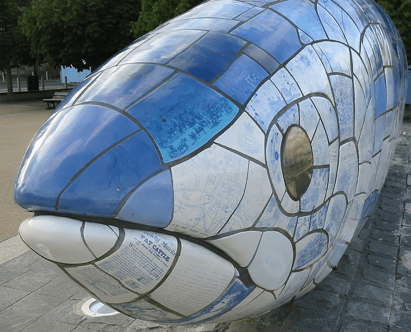 Close-up of the Big Fish or Salmon of Knowledge sculpture in Belfast.