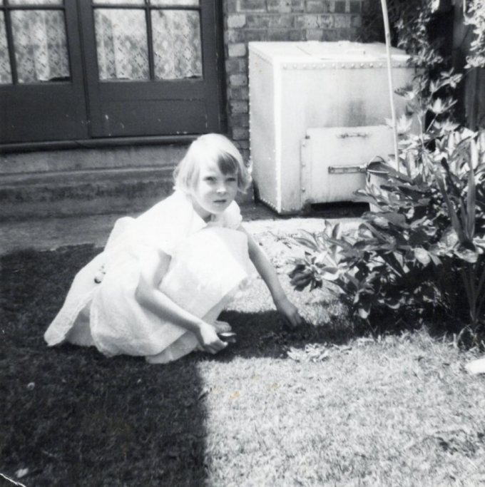 while outside, at the end of the garden,